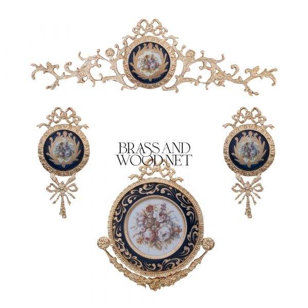 Luxury Ornate Solid Brass Wall Hanging Set with Floral Porcelain Plates