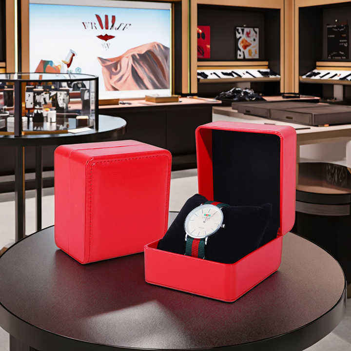 Luxury PU Leather Watch Case Box Black Red Leatherette Packaging with Soft Pillow Round Corner Design Stitch Finish