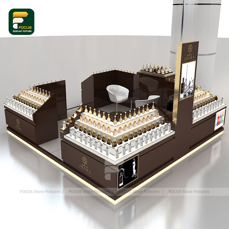 Luxury Perfume Display Counter Island Custom Retail Fixture Brown White Design Glass Shelving Fragrance Showcase Unit