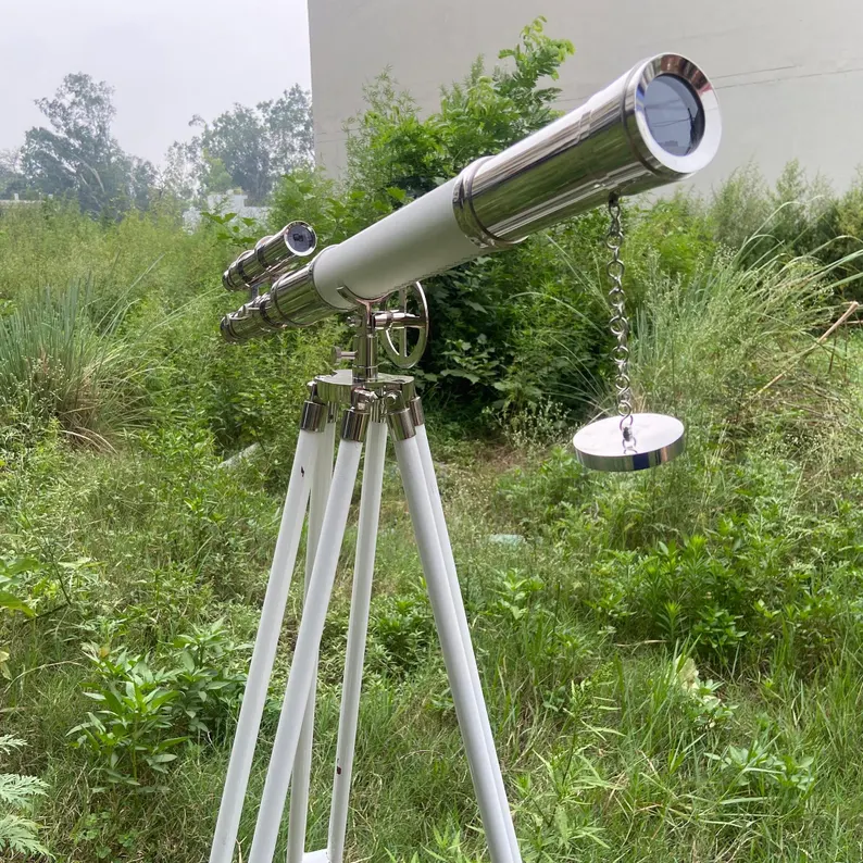 Luxury Personalized Chrome and Brass Double Spyglass on White Tripod Vintage Nautical Telescope Elegant Office Desk Decor Gift