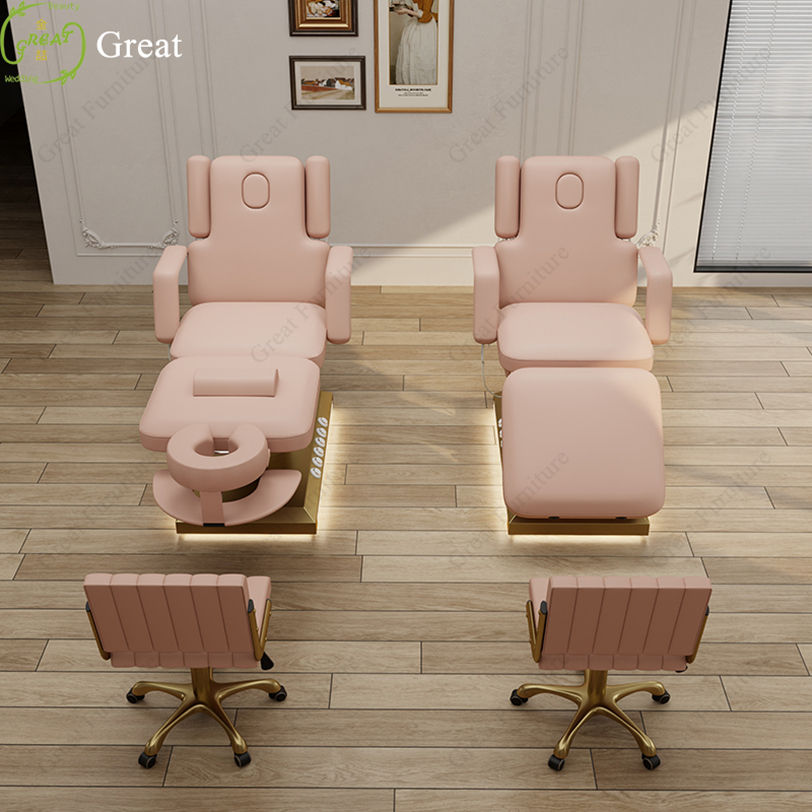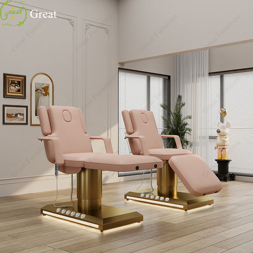 Luxury Pink Leather Beauty Salon Facial Spa Bed Electric Foot Control Gold Base Massage Table With 3 Motors