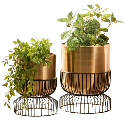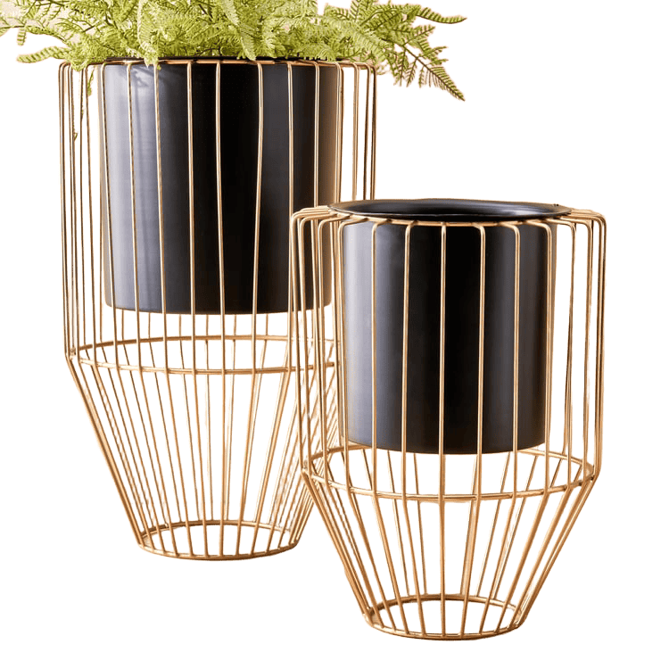 Luxury Planters with Gold Cylindrical Pots and Black Hourglass Wireframe Stands Sculptural Accent for Indoor Home Styling