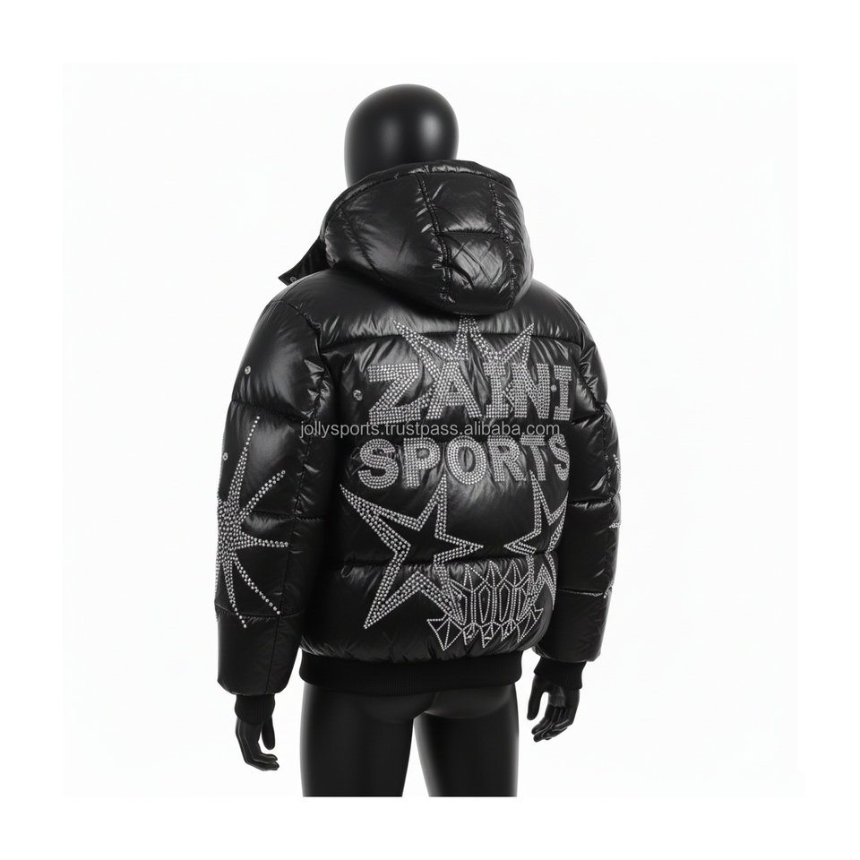 Luxury Puffer Jacket Soft Nylon Fabric Black Gloss Finish Rhinestone Embellished Custom Logo Embroidery Puffer Jacket for man