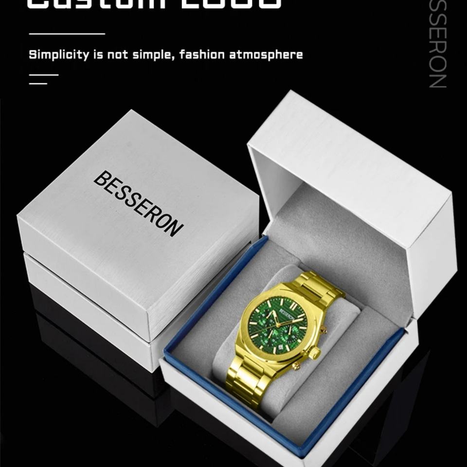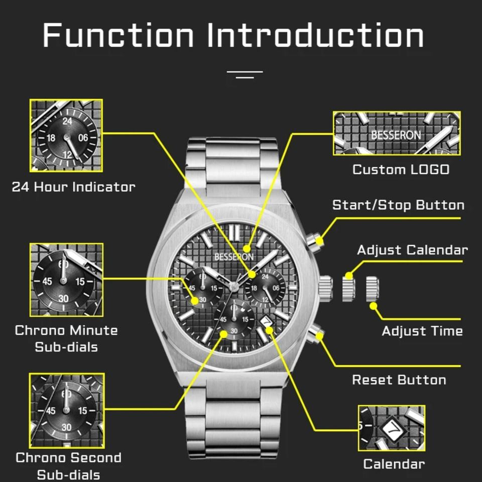 Luxury Quartz Custom Men's Chronograph Watch 316L Stainless Steel Case Band 44mm Analog Dial Water Resistant 5 Bar Fashion