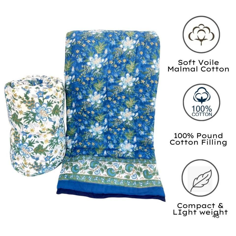 Luxury Quilts Jaipur Hand Block Printed 100% Cotton Quilt Blankets Floral Pattern Double Bed Cover Soft Lightweight with Kantha