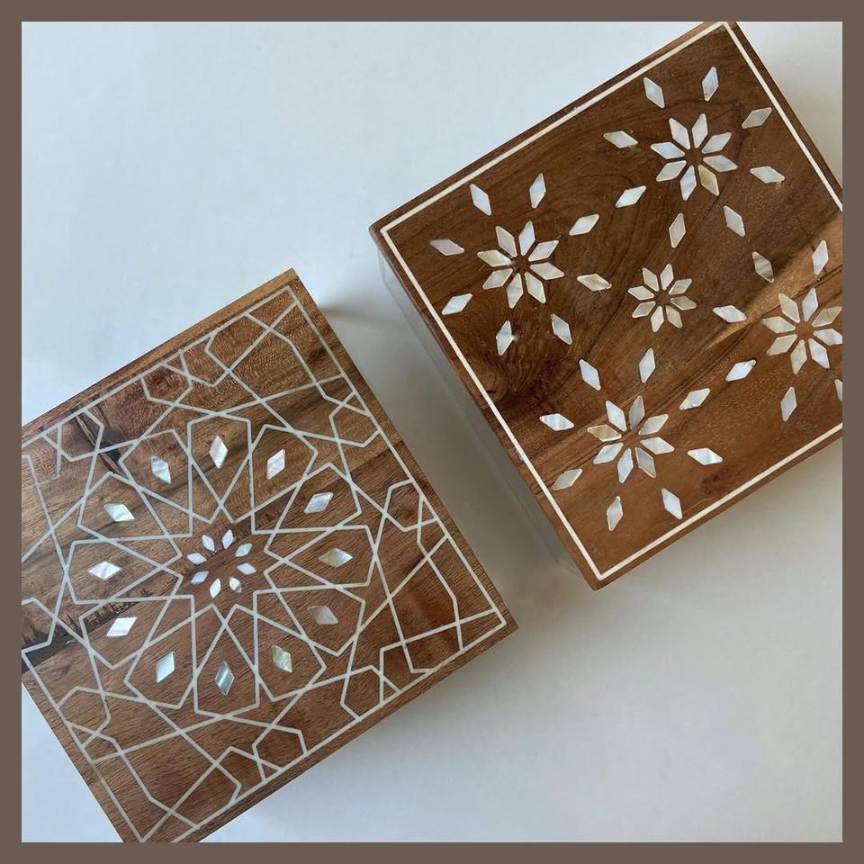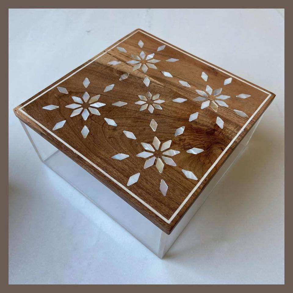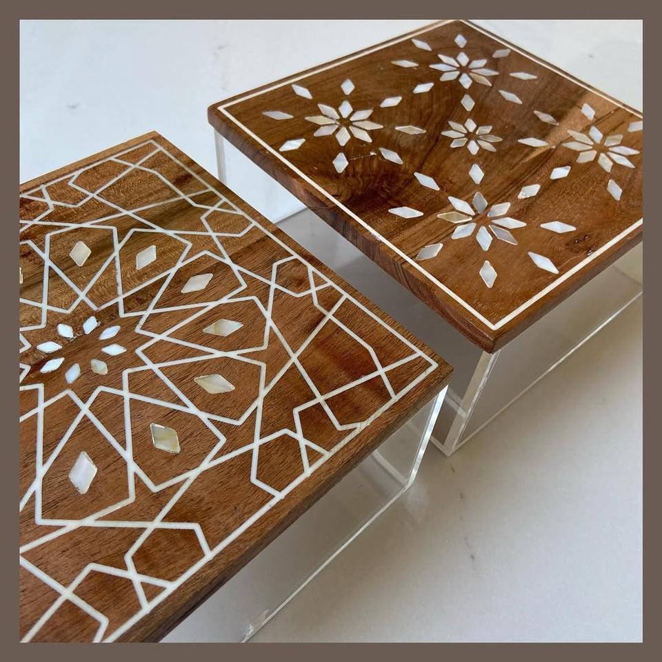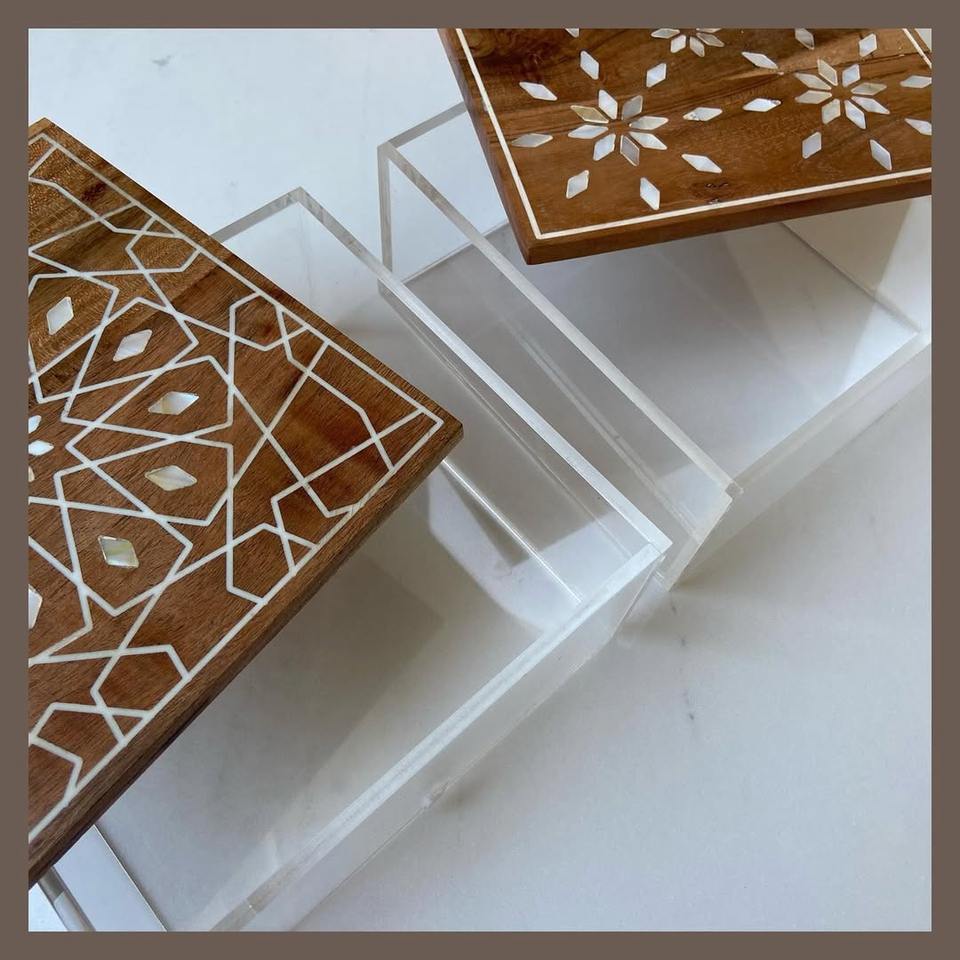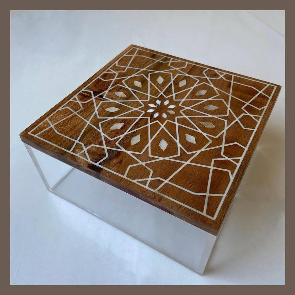 Luxury Ramadan and Eid Gift Box Set with Wooden Lid Mother of Pearl Inlay and Acrylic Base Handmade for a Unique Arabian Style