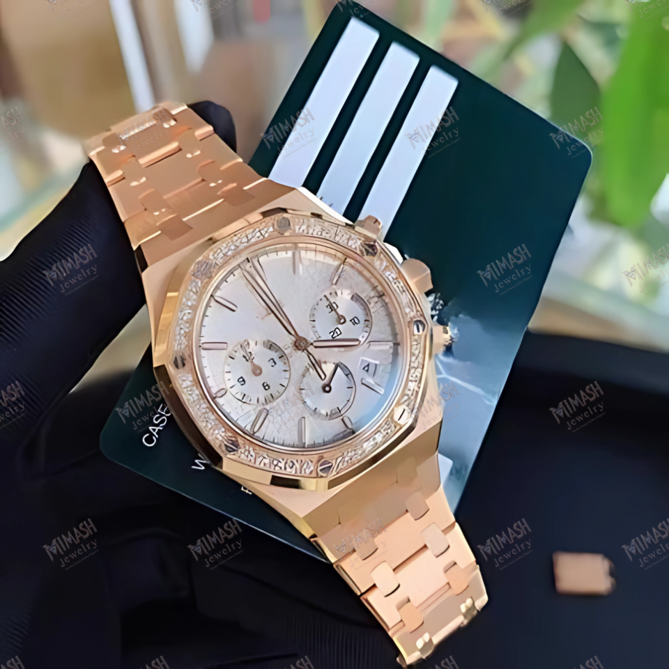 Luxury Rose Gold Chronograph Watch with Iced Out Diamond Bezel, White Dial & Stainless Steel Band Elegant Men Timepiece