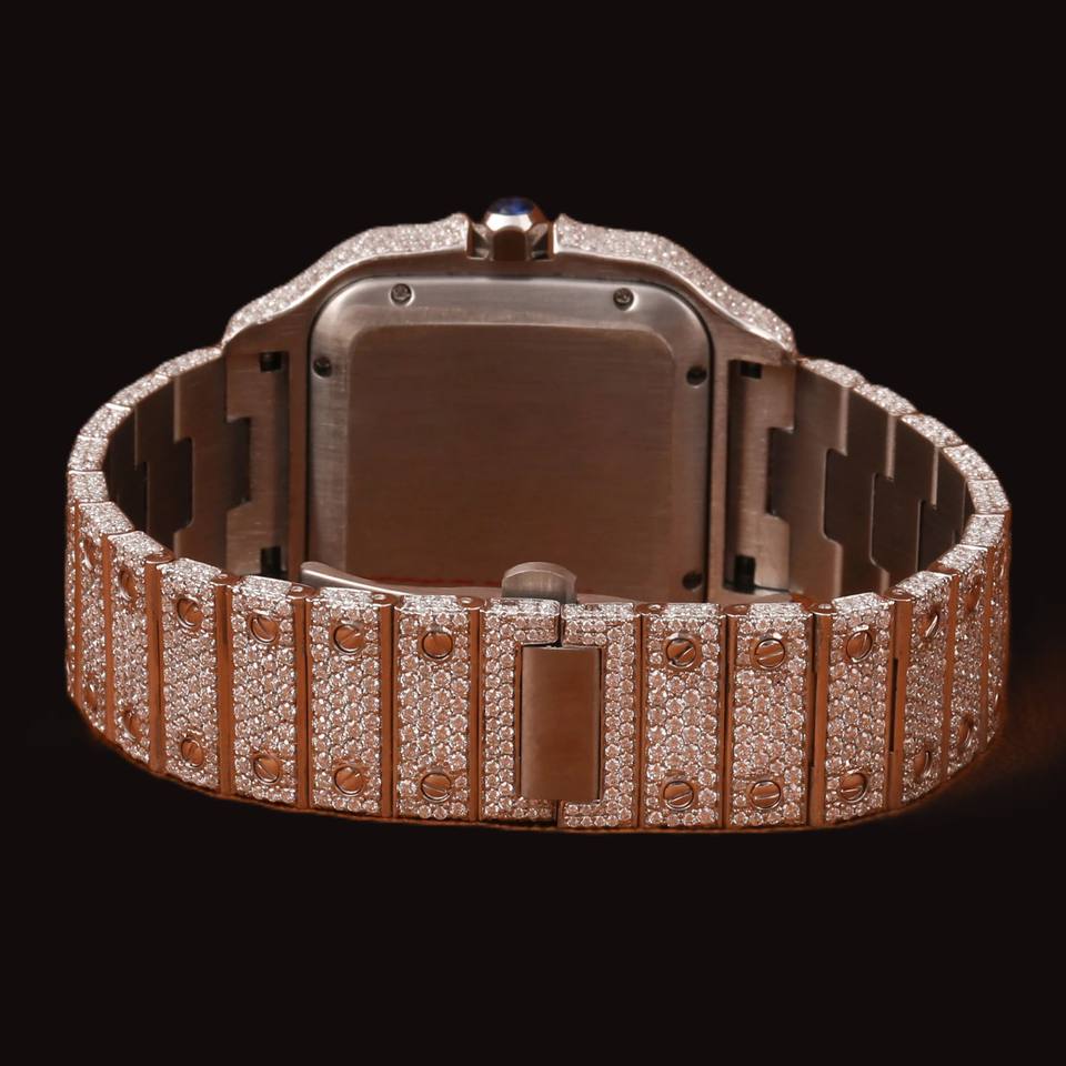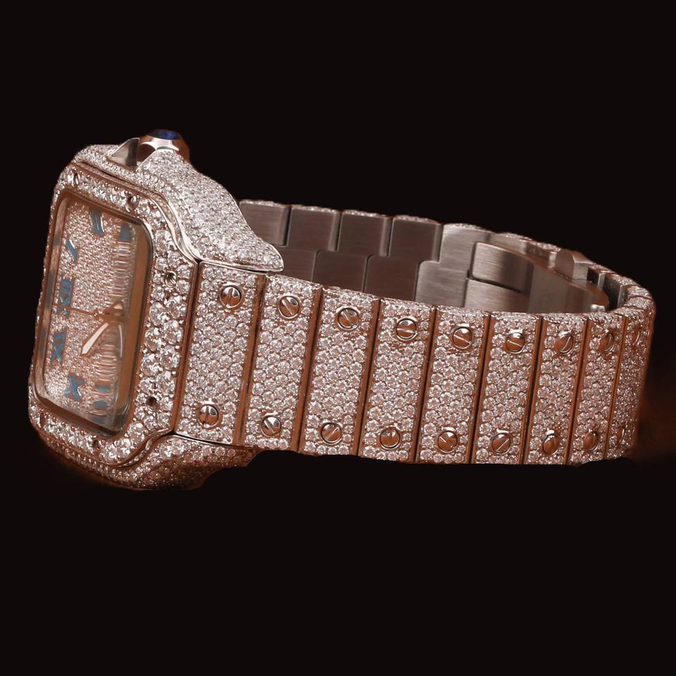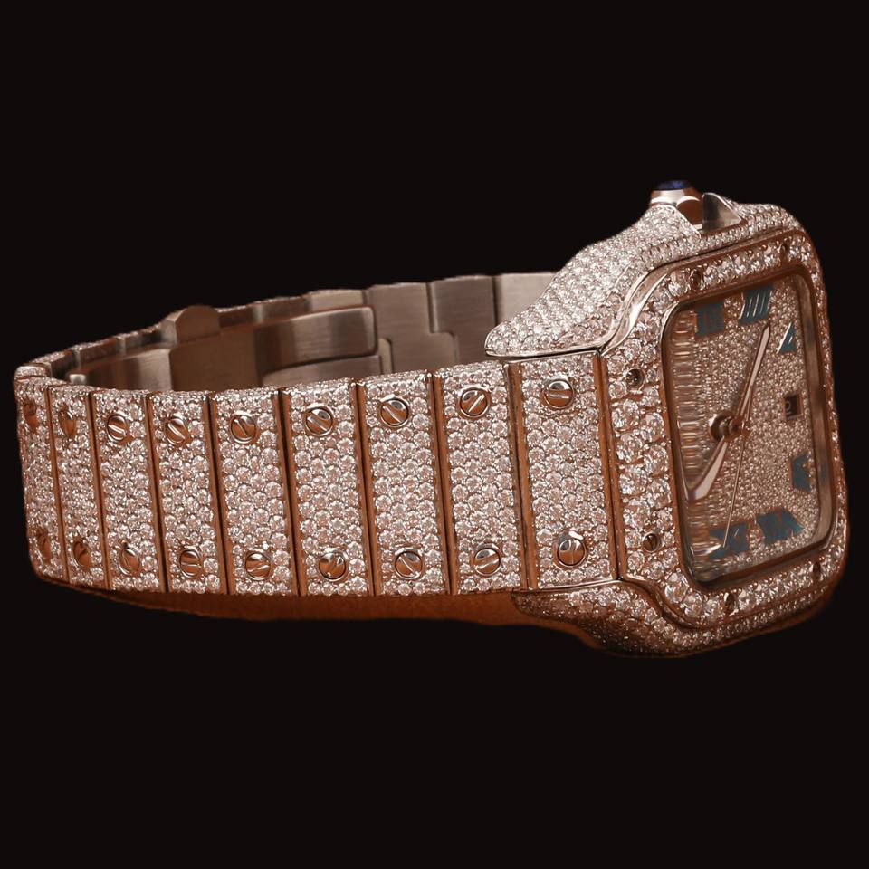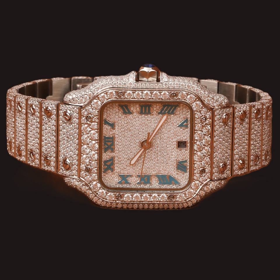 Luxury Rose Gold Moissanite Diamond Fashion Watch Fully Iced Dial Roman Numerals ETA Quartz Movement Hip Hop Style Customized