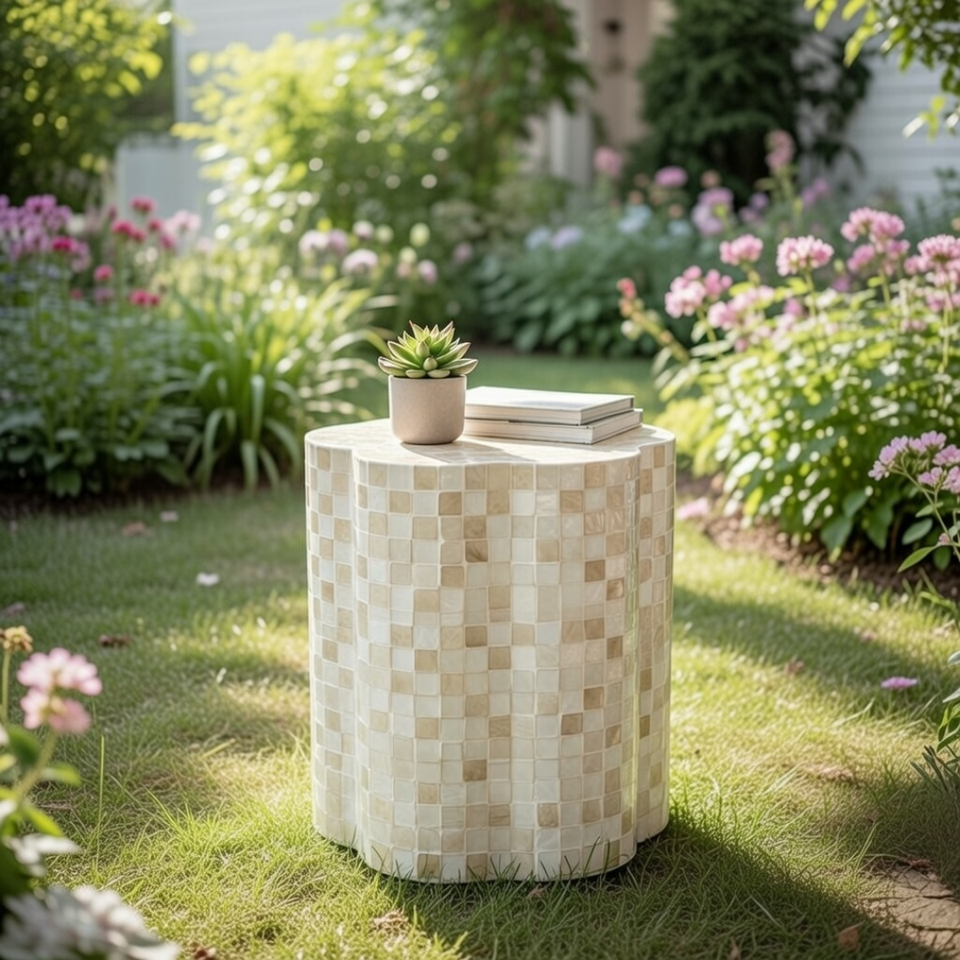 Luxury Round Capiz Shell Inlay Coffee Table Nautical Blue Mother of Pearl Inlaid Drum Table for Living Room Home Decor