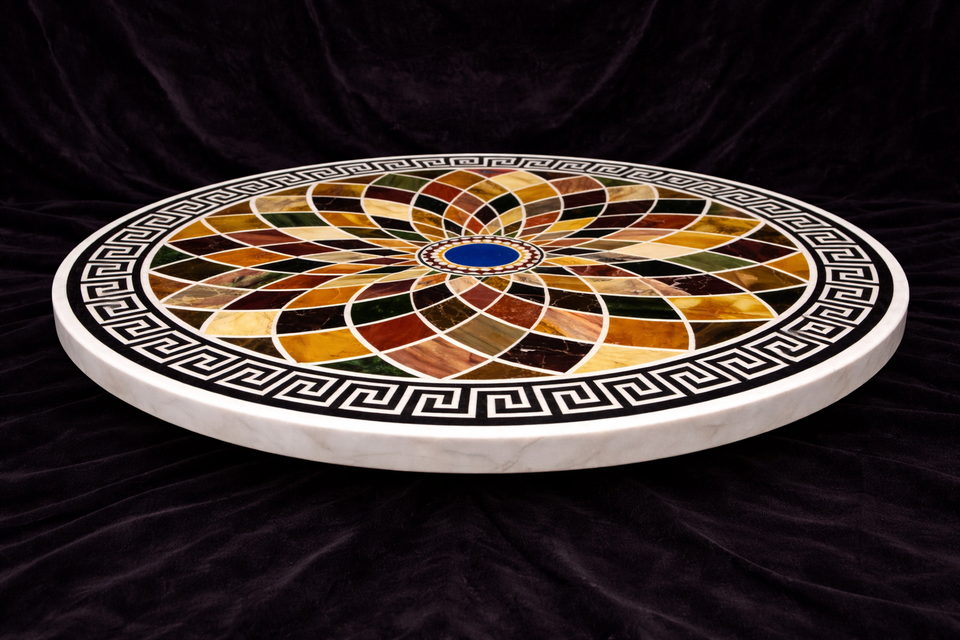 Luxury Round Marble Inlay Table Top Handmade Pietra Dura Floral Lotus Design Semi Precious Stone Inlay White Marble Center Table
