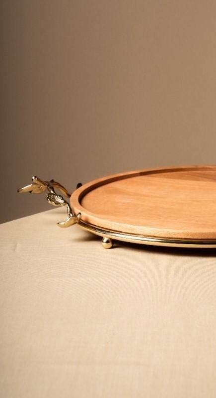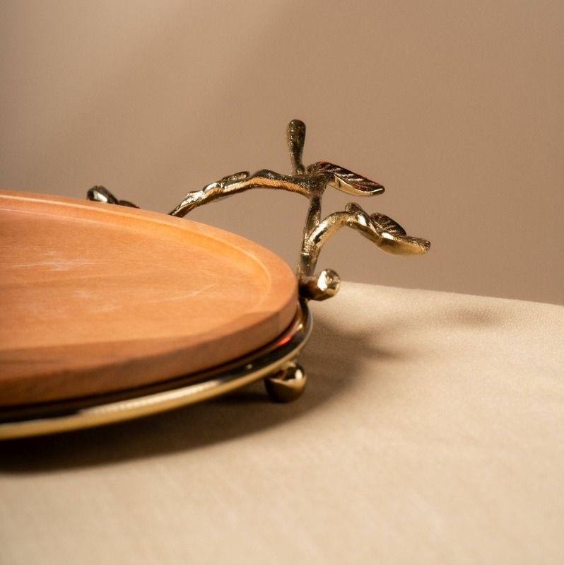Luxury Round Wooden Serving Tray with Gold Metal Floral Handles Decorative Acacia Wood Platter for Coffee Table Tea Food Cake
