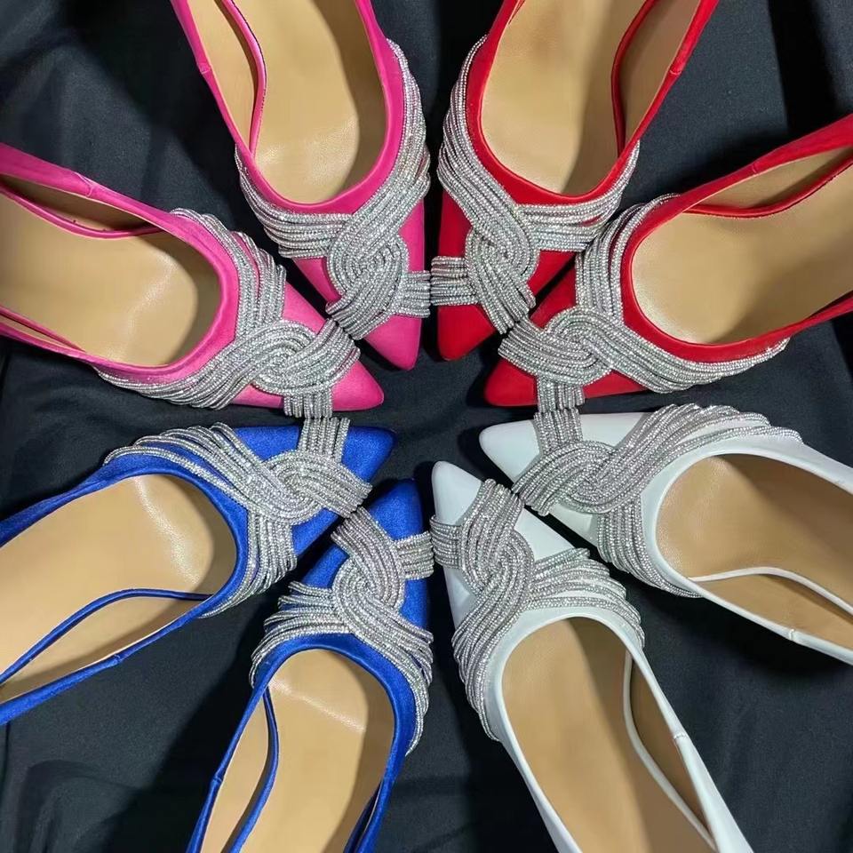Luxury Satin Ladies Crystals Pump 8.5cm Thin Heel Women Pointed Toe Shoes Many Colors OEM Direct Factory