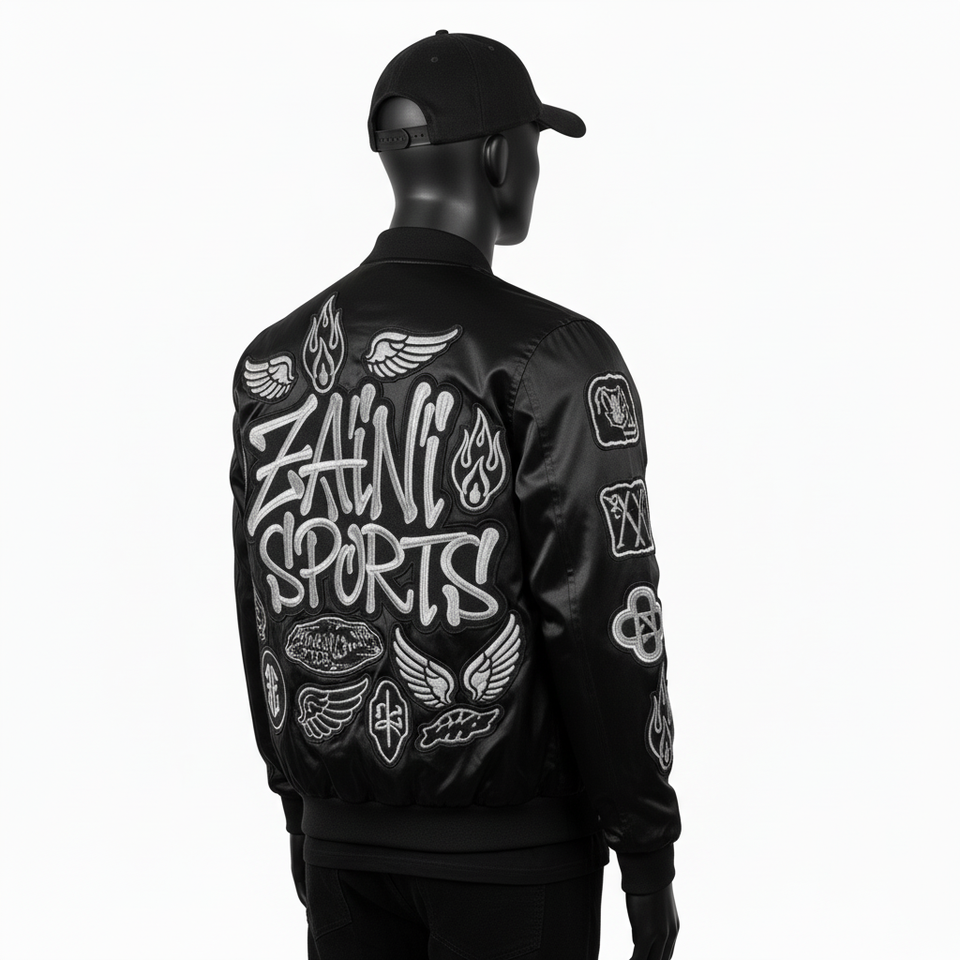 Luxury Satin Varsity Jacket Smooth Shine Fabric Black Color Custom Embroidered Logo Personalized Design Satin Jacket For Men