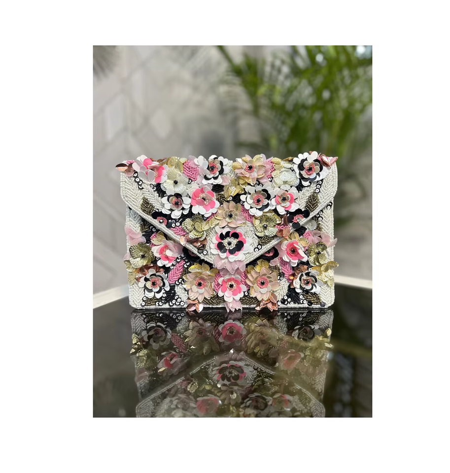 Luxury Silk Clouds Flower Design Evening Clutch Bag with Pearls and Small Rhinestone Chain Cotton Lining for Weddings Parties