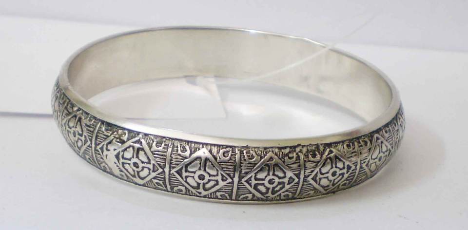 Luxury Silver Plated Copper Bangle With Intricate Geometric Diamond Pattern Etching Sophisticated Antique Style Metal Crafted