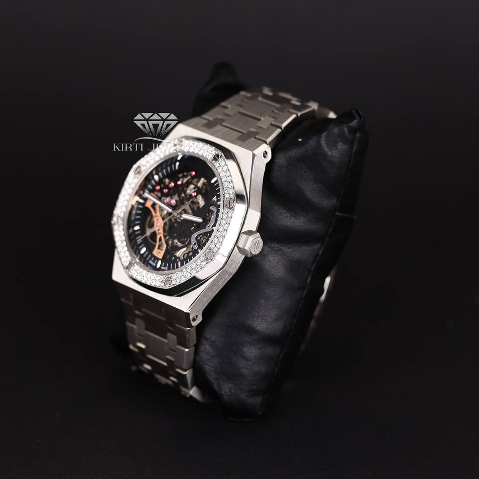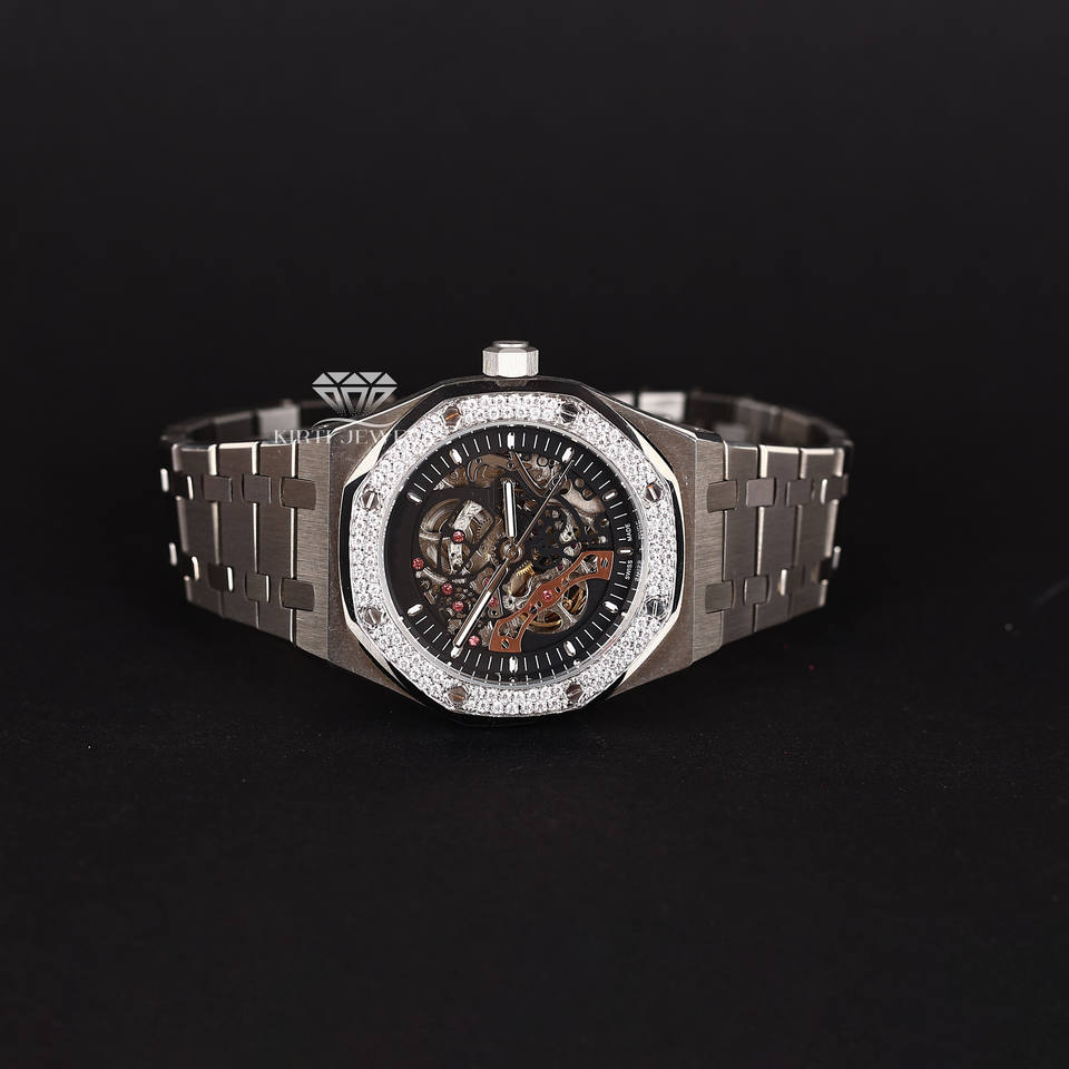 Luxury Skeleton Dial Watch for Men Iced Out Diamond Stone Set Bezel Stainless Steel Everyday Automatic Mechanical Wristwatch