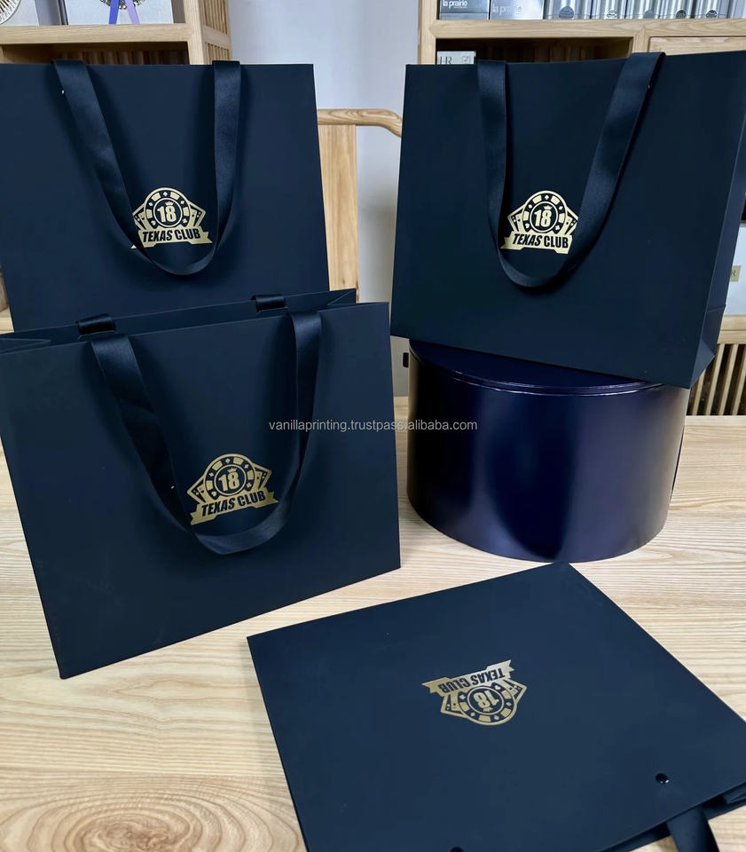Luxury Soft Touch Paper Bag with Satin Ribbon Handle | Custom Gold Foil Hot Stamping Shopping Gift Bag Supplier