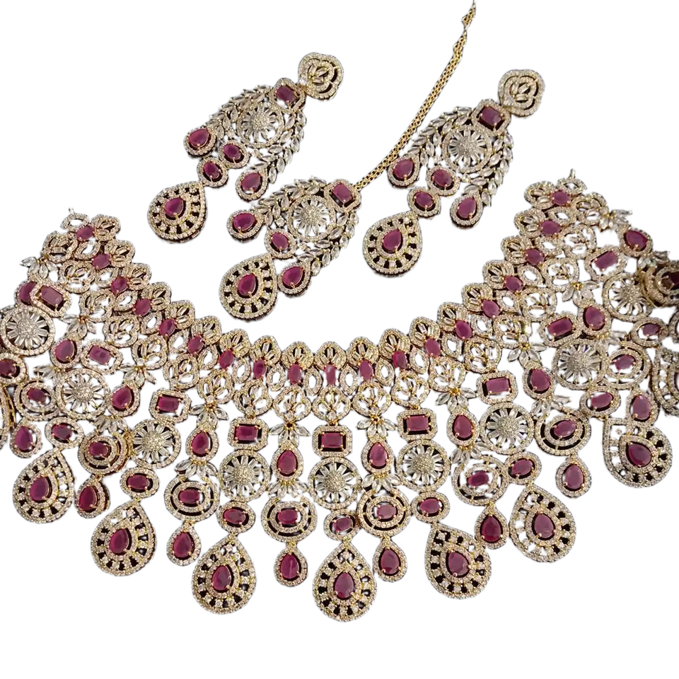 Luxury South Asian wedding jewelry with fine detailing Embellished bridal necklace set with ruby and pearl drops
