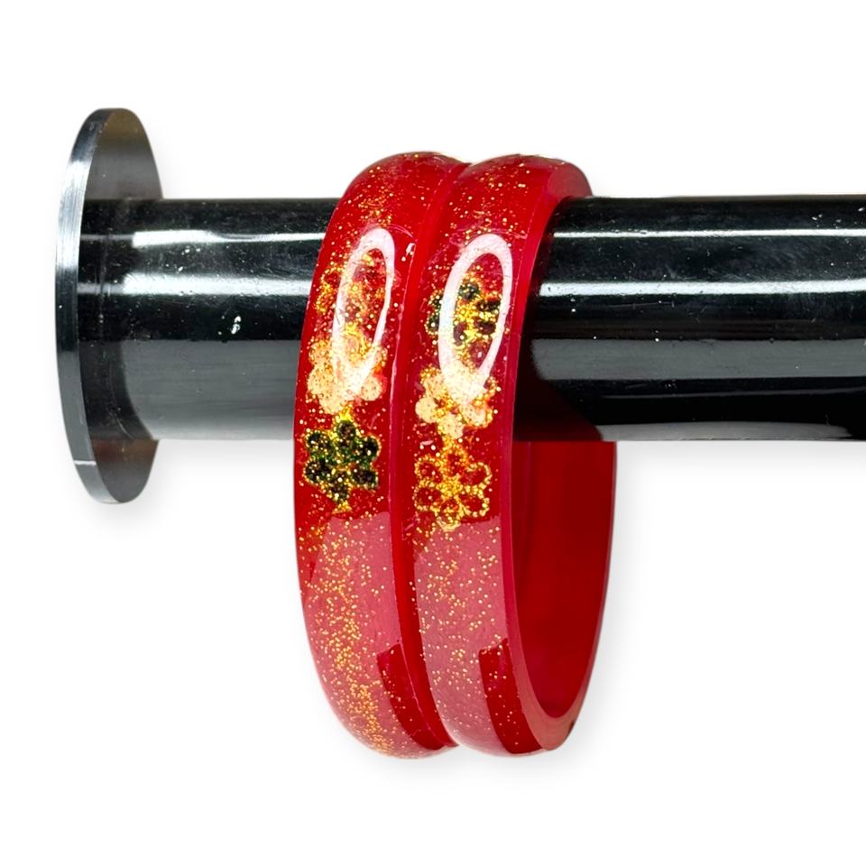 Luxury Sparkling Imitation Pearl Emerald Cut Flower Design Trendy Red Acrylic Bangle Set Gold Plated Wedding Wear