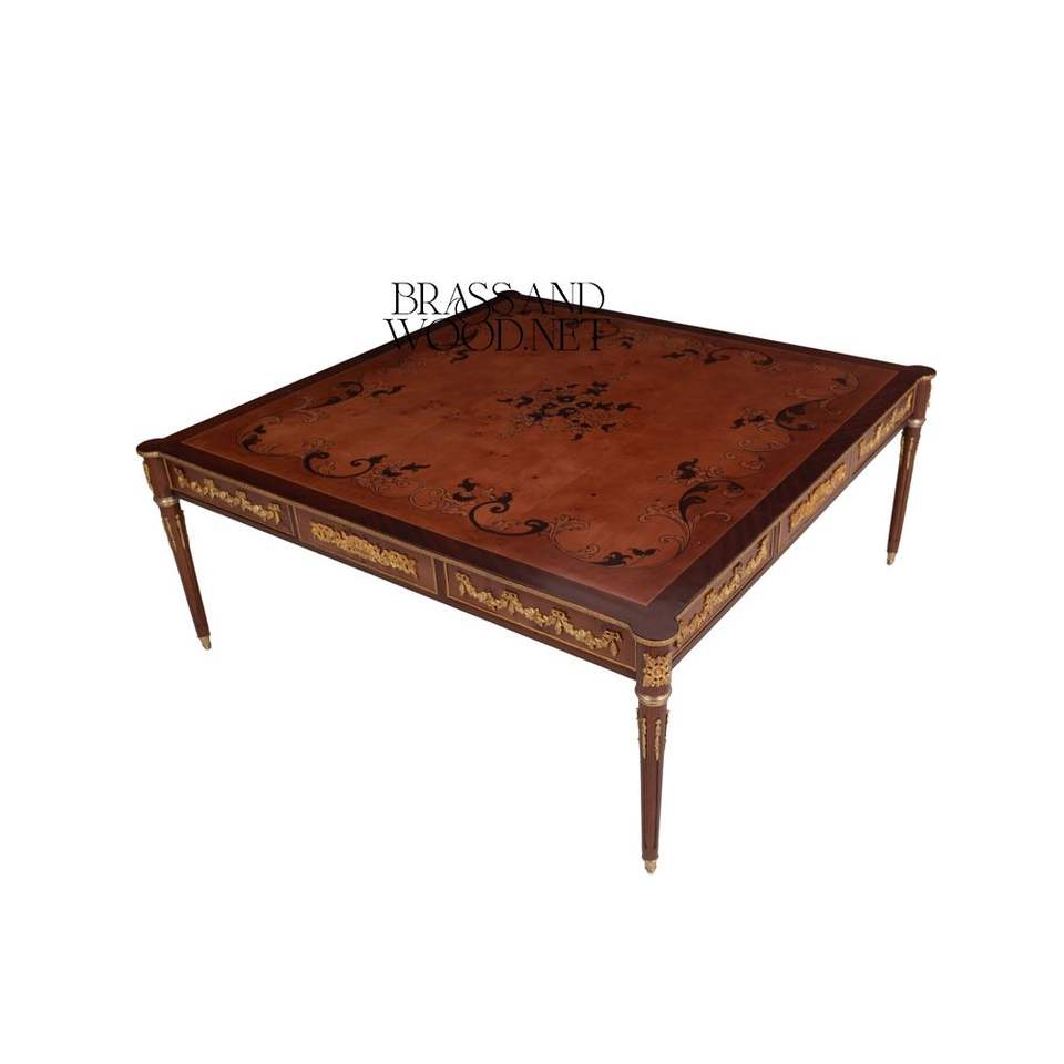 Luxury Square Coffee Table with Intricate Wood Inlays and Brass Detailing for Elegant and Timeless Living Room Decor