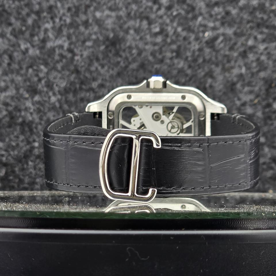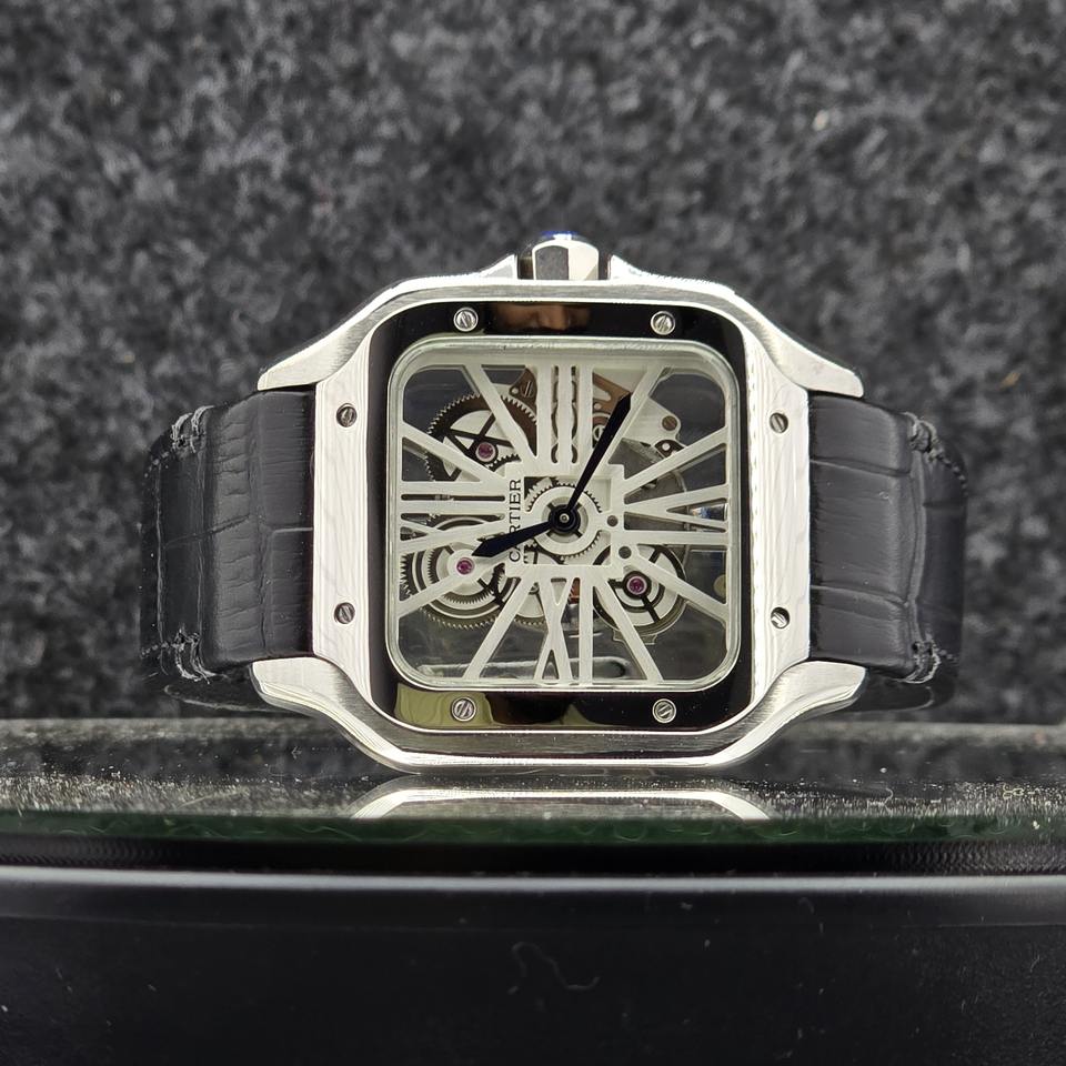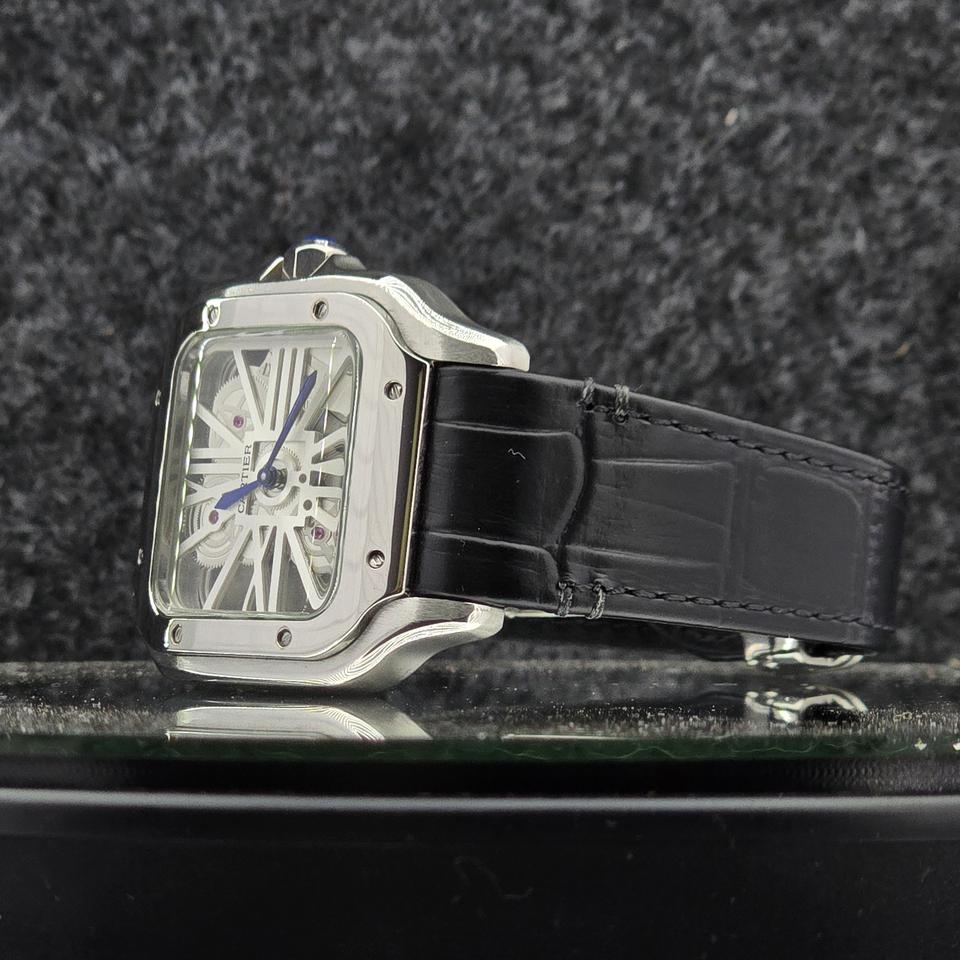 Luxury Square Skeleton Men's Watch Mechanical Automatic Movement Analog Roman Numeral Dial Stainless Steel Black Leather Strap