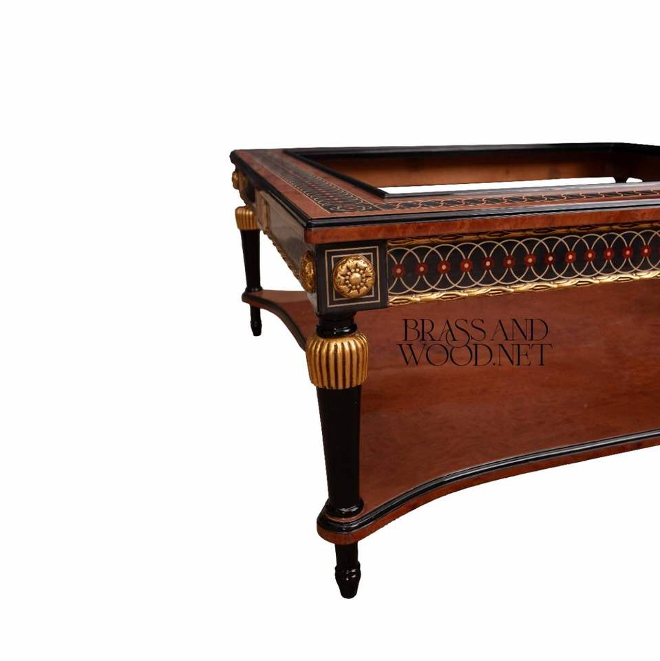 Luxury Square Wooden Coffee Table with Intricate Geometric Inlays Black Accents and Golden Details for Elegant Home Decor