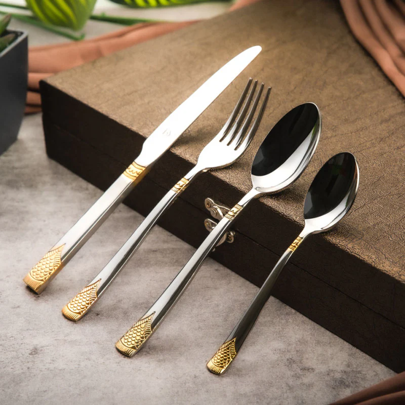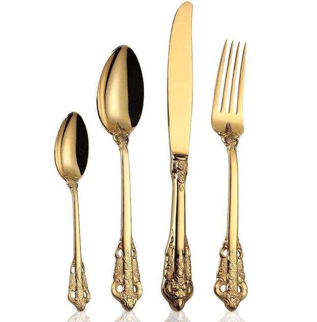 Luxury Stainless Steel Cutlery with Gold Motif with Knife Fork Spoon Set and Decorative Textured Textured Handles