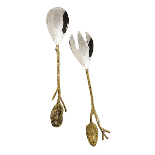 Luxury Stainless Steel Salad Serving Cutlery Set with Unique Gold Tone Twig Handles Dishwasher Safe for Home & Hotel Use