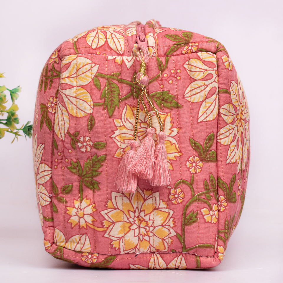 Luxury Style Large Capacity Hanging Portable Cosmetic Quilted Cotton Eco-Friendly Makeup Bag Hand Block Print Washable Zipper
