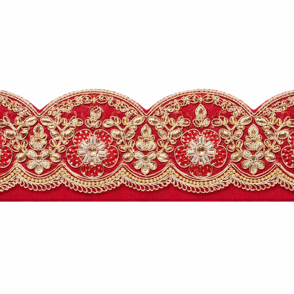 Luxury Traditional Floral Embroidered Eco-Friendly Lace Trim Zari Bead Work Red Fabric for Bridal Wear Sarees Couture Garments