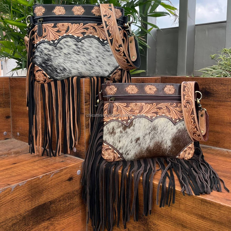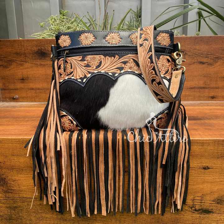 Hand Tooled Cowhide Leather Fringe Crossbody Bag