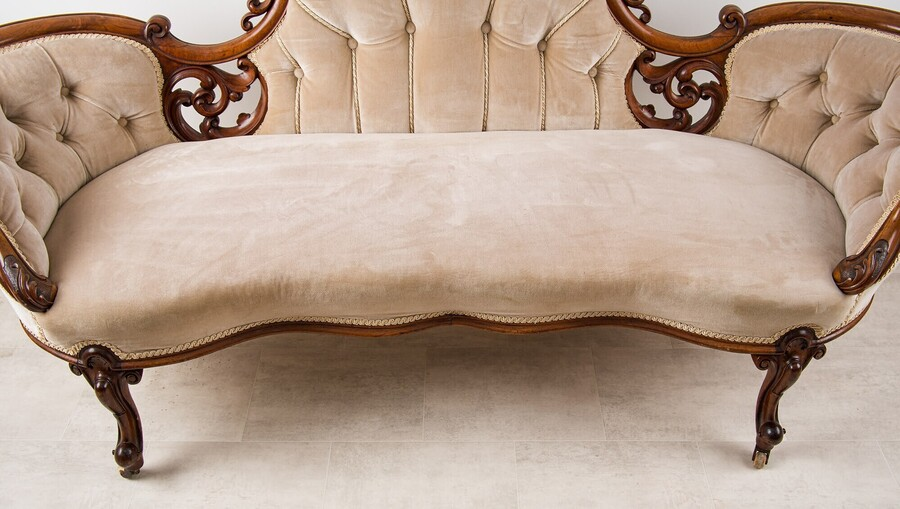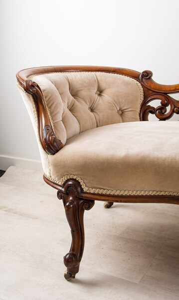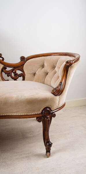 Luxury Tufted Velvet Chaise Lounge Featuring Classic Rococo Scrollwork and Brass Casters