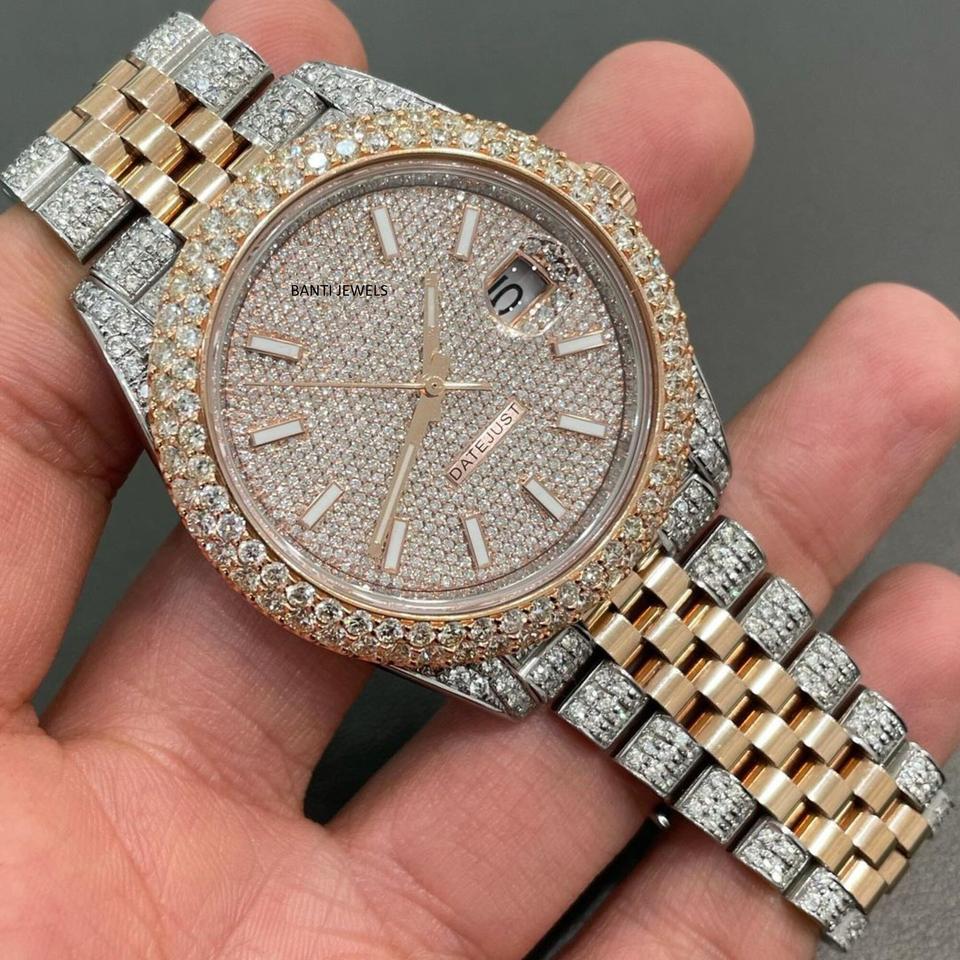 Luxury Antique Two Tone Moissanite Watch Iced Out Rose Gold Silver Hip Hop Jewelry VVS1 Diamond Dial 20mm Band