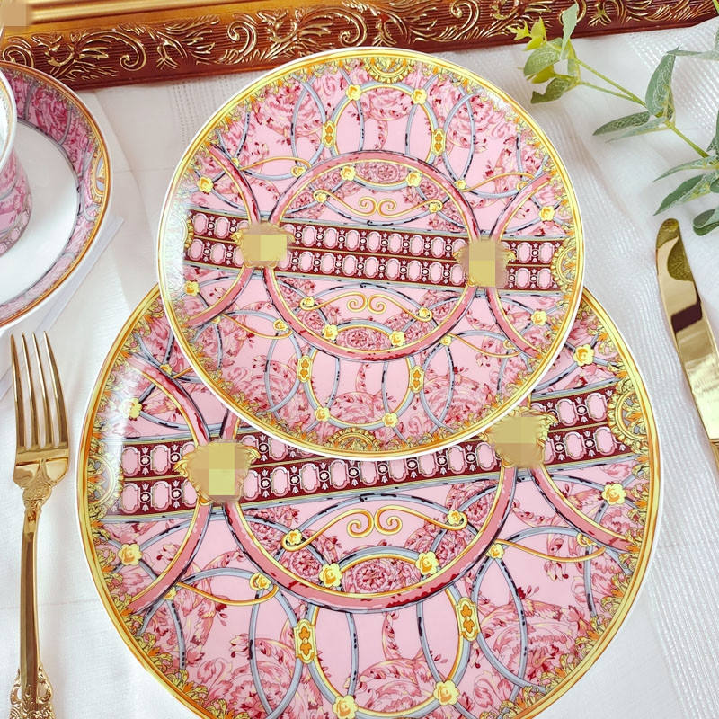 Luxury V Series Flat Disc Bone China Dinnerware Set Ceramic Steak Plate Dessert Dried Fruit Cake Plate Cup Saucer for Tea Coffee
