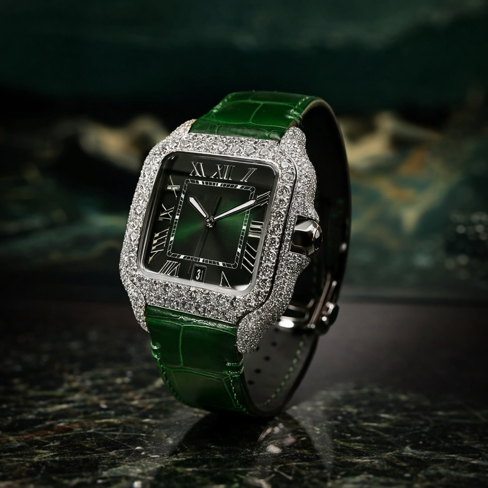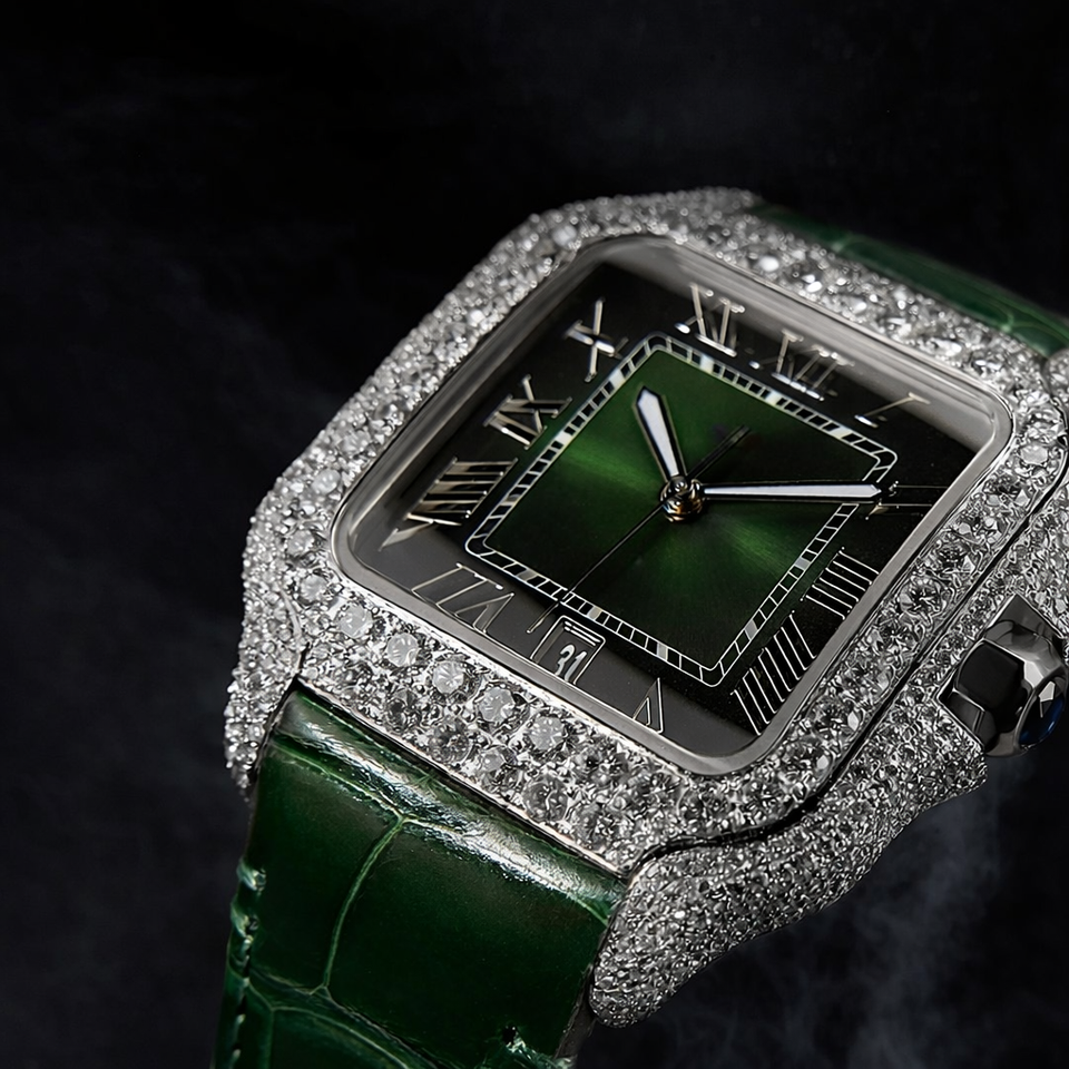 Luxury Vintage VVS Moissanite Hip Hop Modern Green Leather Belt Watch Glass Dial Iced Diamond Automatic Movement Stainless Steel
