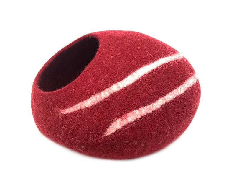Luxury Warm Cozy Handmade Red Cat Cave with White Stripes Felted Natural Wool Pet Bed Furniture Nepal Style Solid Pattern