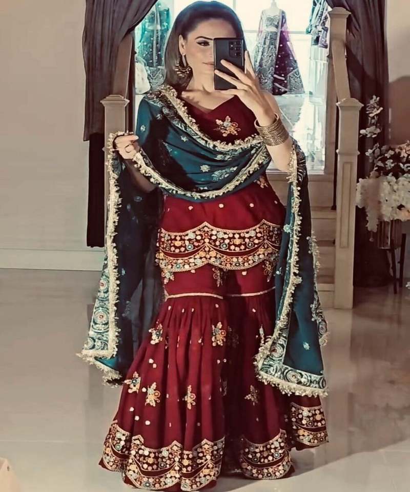 Luxury Wedding Wear Chinon Salwar Kameez with Regal Checks Pattern and Pearl Detailing Sharara .