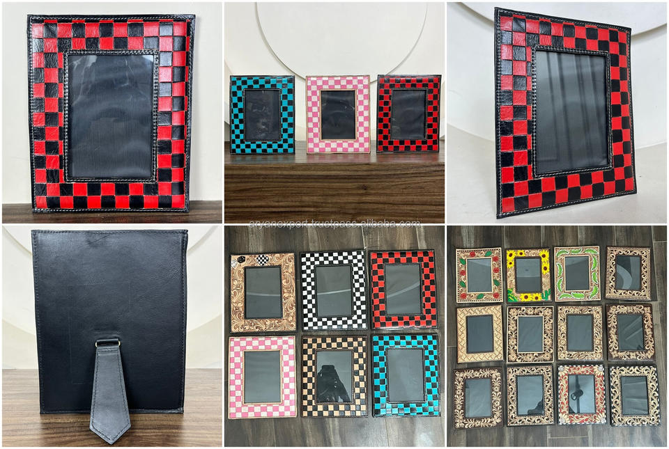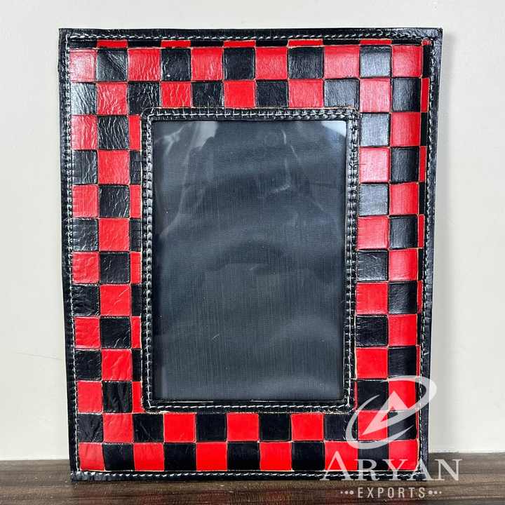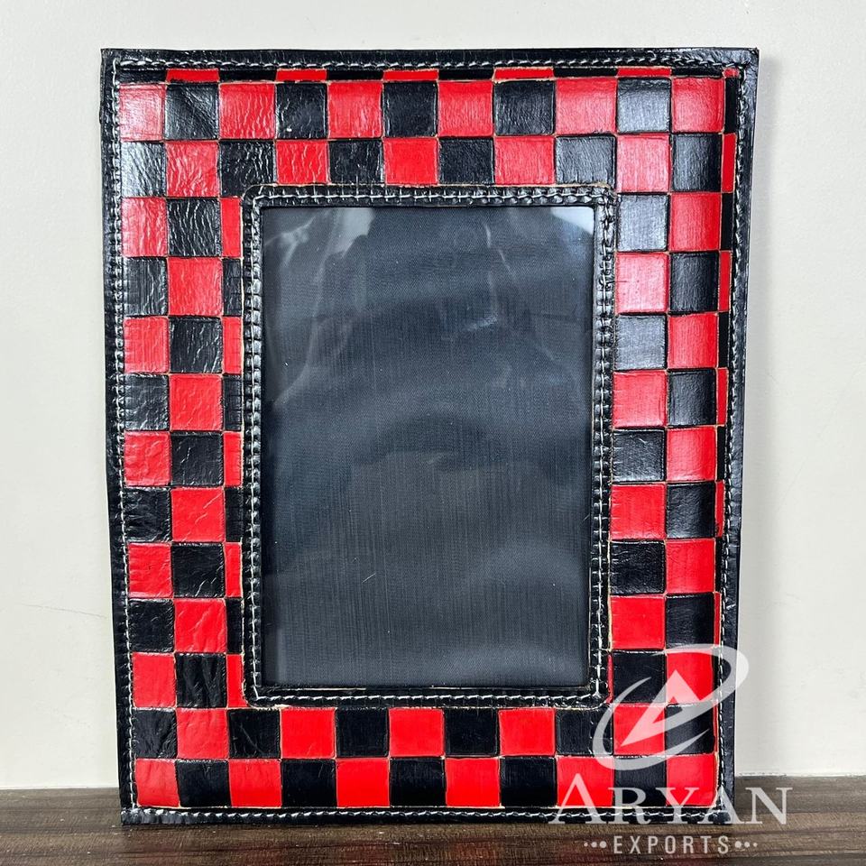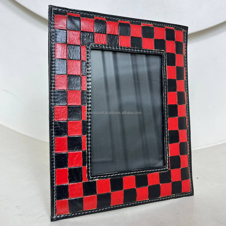 Luxury Western Black & Red Checkerboard Pattern Photo Frame Hand Tooled Genuine Leather Creative Design for Home Office Decor