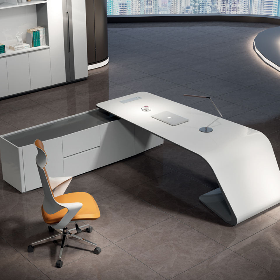 Luxury White Glossy MDF CEO Ergonomic L-shape Executive Office Desk with Side Drawers Modern Design 3-Year Warranty