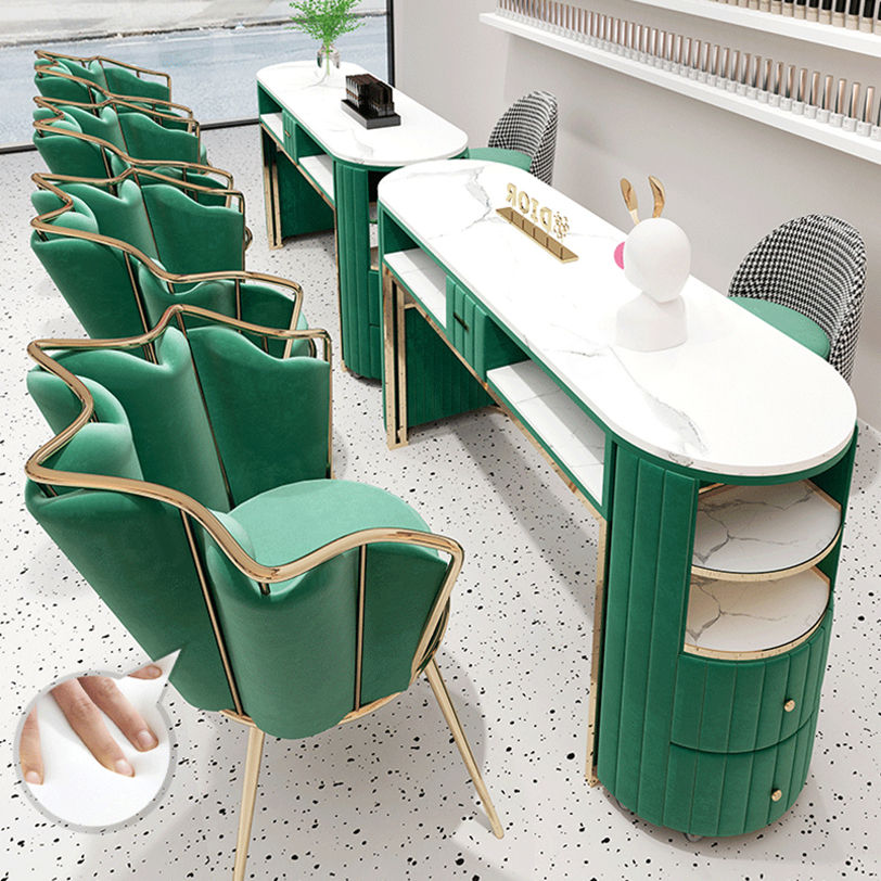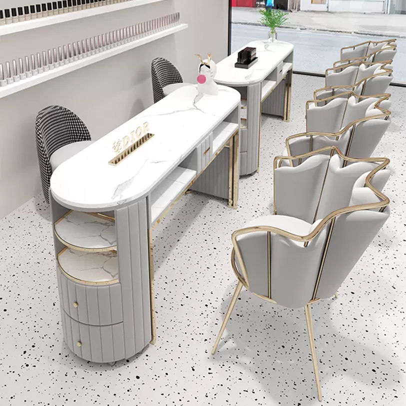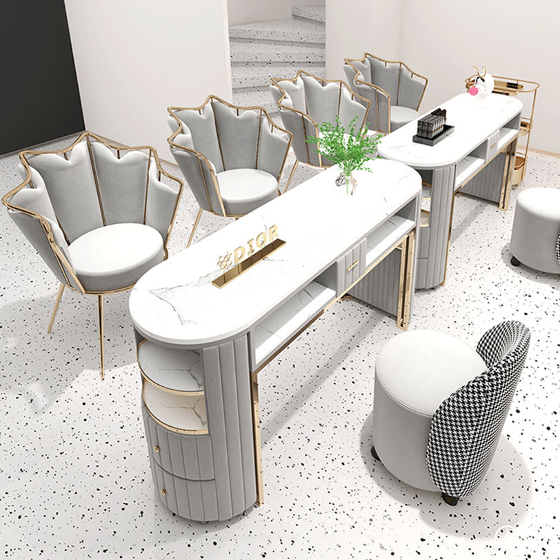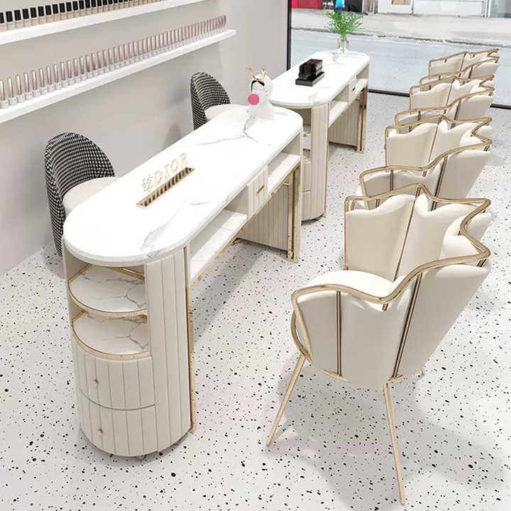 Luxury White Gold Beauty Shop Nail Salon Table Double Marble Top Nail Desk and Chair With Drawers