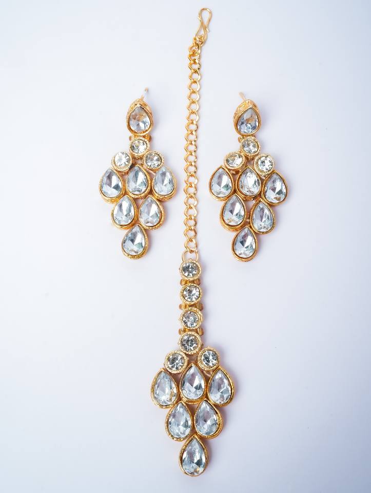 Luxury White Zircon Pear Cut Jewelry Set Gold Plated Water Drop Choker Necklace Earrings Maang Tikka Traditional Wedding Womens