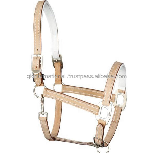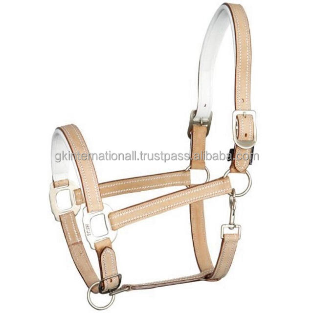 Luxury White Padded Genuine Leather Horse Halter with Heavy Duty Double Crown Brass Buckle and Adjustable Headpiece & Chin