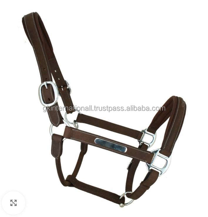 Luxury White Stitched Heavy Duty Padded Leather Horse Halter with Personalized Nickel Name Plate and Adjustable Brass Hardware