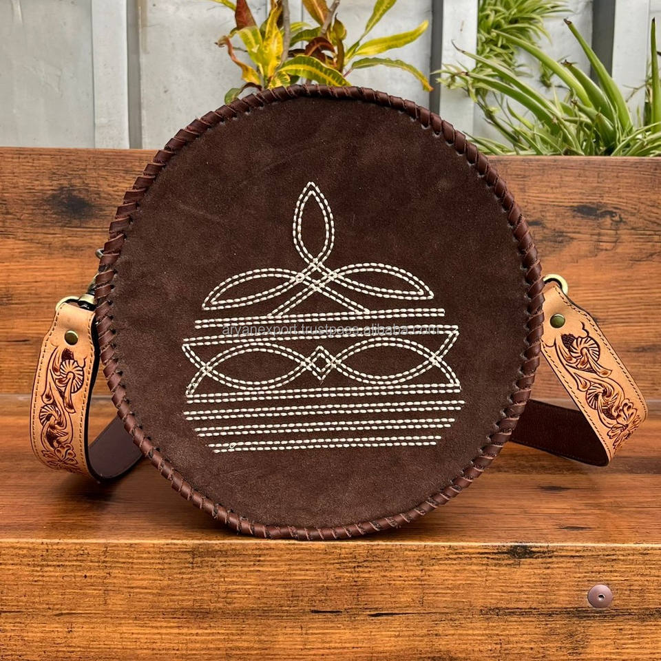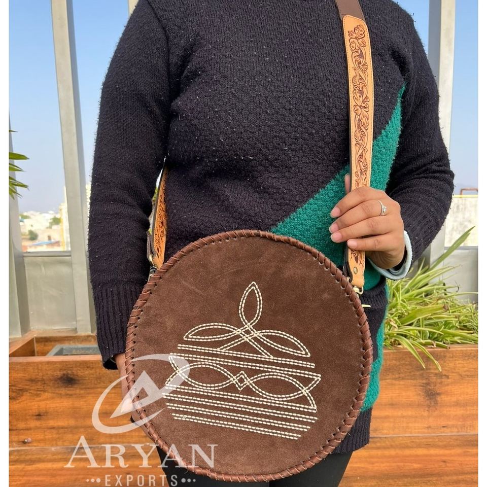 Product name:Hand Tooled Suede Leather Round Crossbody Bag