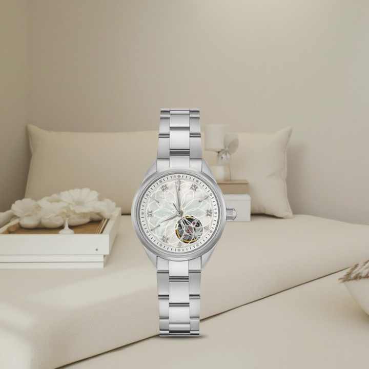 Luxury Women's Silver Automatic Watch Diamond Markers Miyota 6T28 Mechanical Movement Analog Dial Stainless Steel Band Alarm