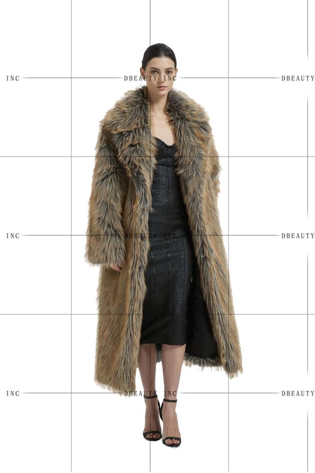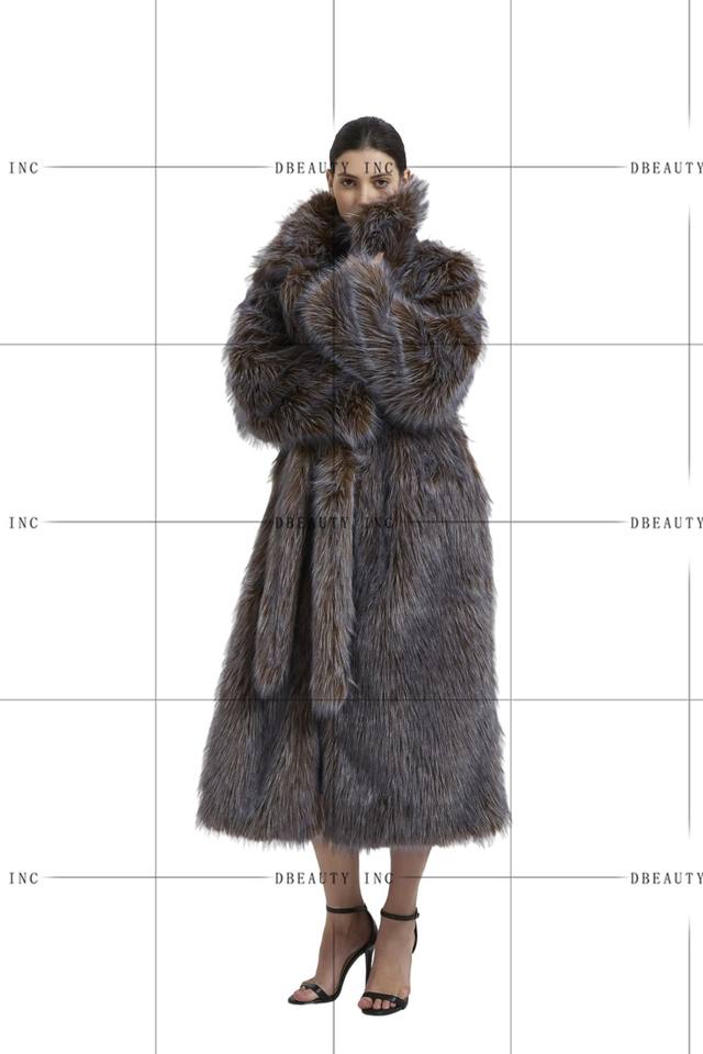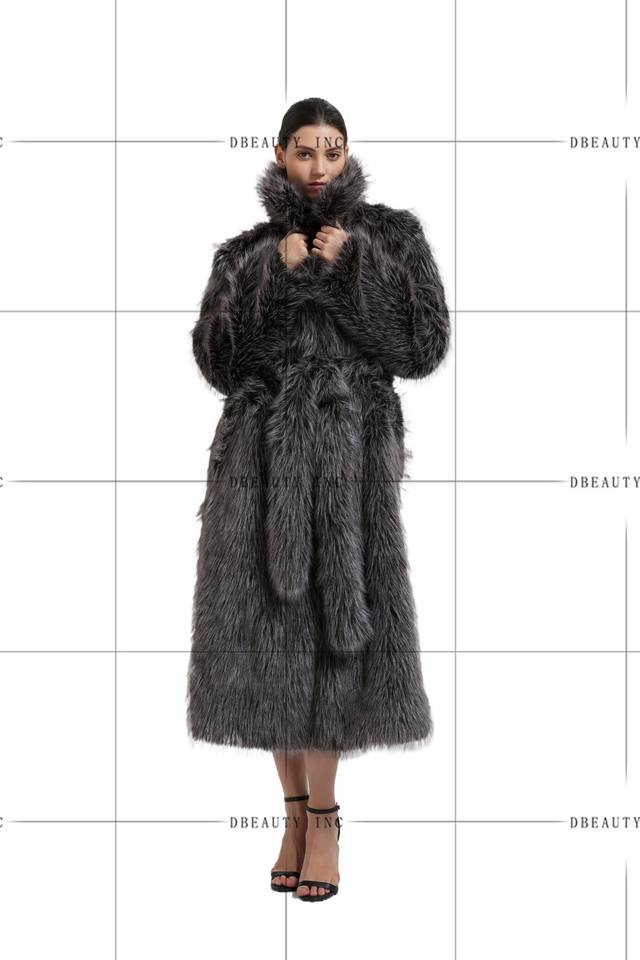 Luxury Women's Woolen Faux Fox Fur Windproof ELEGANT Coat Turn-down Collar Shawl Overcoat Pockets Belt Long Outerwear 3D Pattern