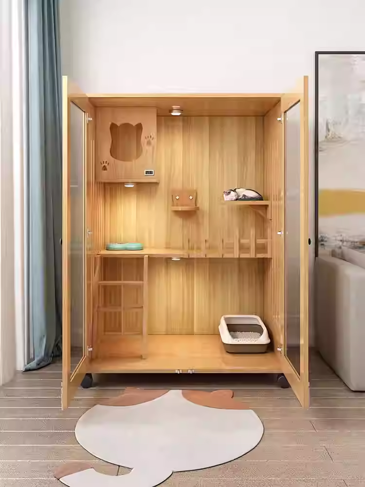 Luxury Wooden Cat Villa with Glass Door Multi-Level Cat Condo with Wheels Customized Cat Wooden house