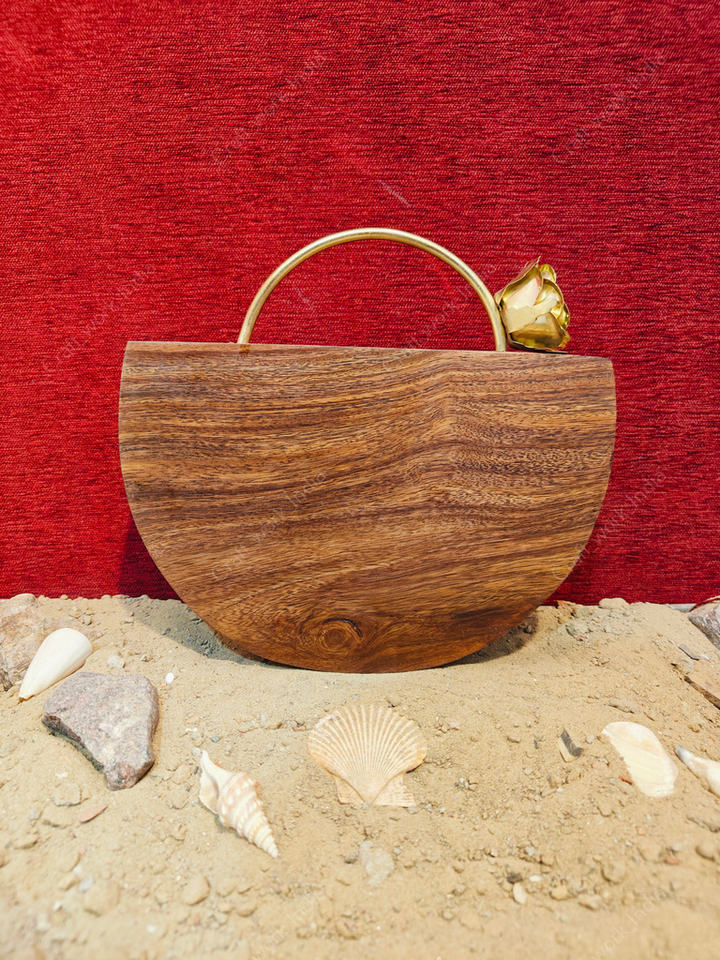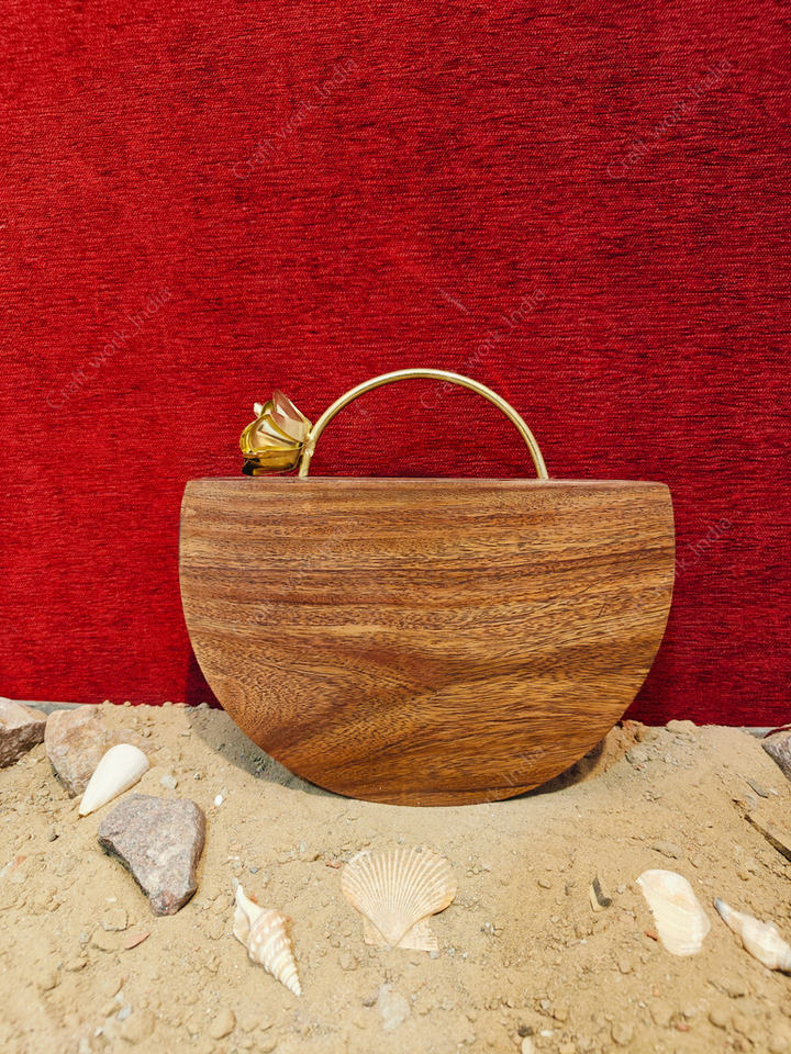 Luxury Wooden Clutch Handbag with Brass Floral Handle Designer Evening Party Wedding Semi Circle Hard Case Bag