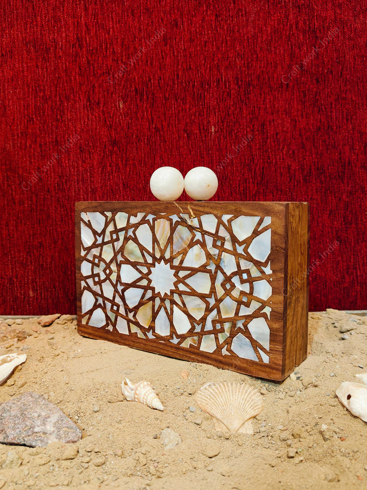 Luxury Wooden Clutch Handbag with Mother of Pearl Inlay Designer Evening Party Wedding Hard Case Clutch Bag