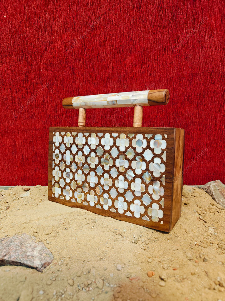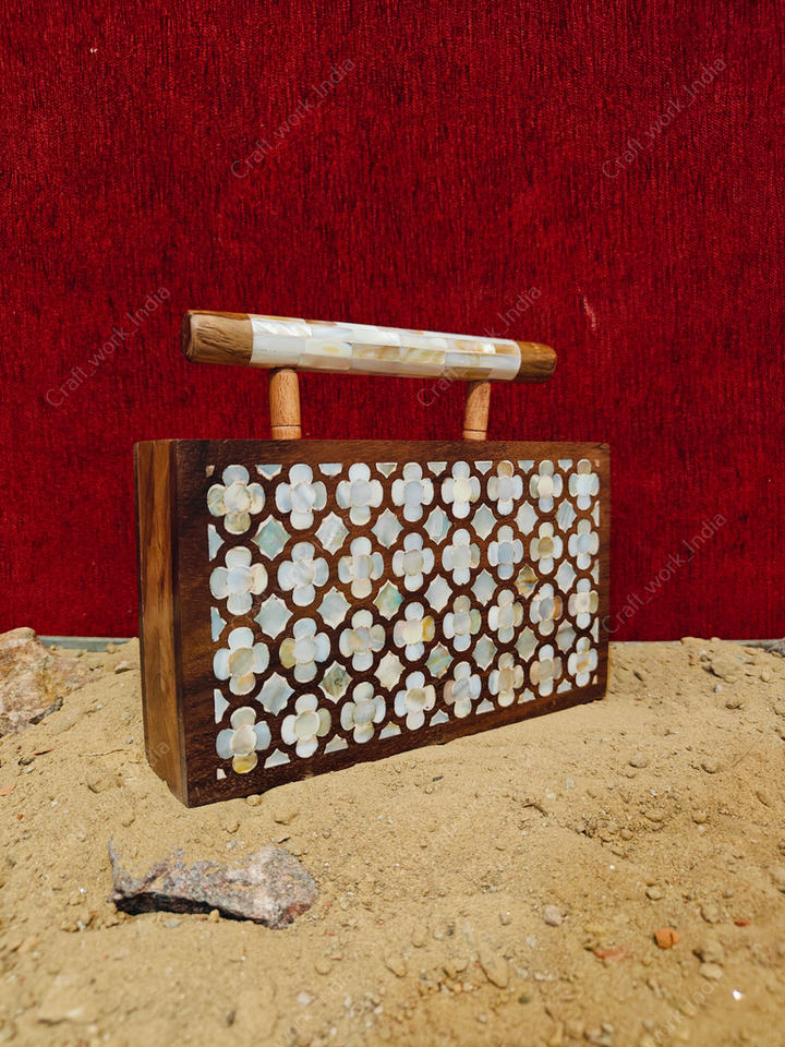 Luxury Wooden Clutch Handbag with Mother of Pearl Floral Inlay Top Handle Designer Evening Party Wedding Bag